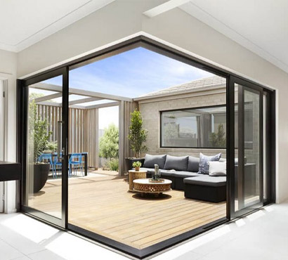When a flamboyant entrance to balconies and gardens is needed, aluminium corner slider doors are the most popular option. Ventana Design's aluminium corner sliding doors, which come with a thermal break system, provide the most natural light and a 360-degree view. Additionally, they have sashes and frames that are hidden. These doors can be set up with 2 panels on one side and 4 panels on the other. One of the most elegant door ideas for giving purpose to corners in your space is the corner slider door. Aluminium corner slider doors from Fenesta are made with the highest quality materials.